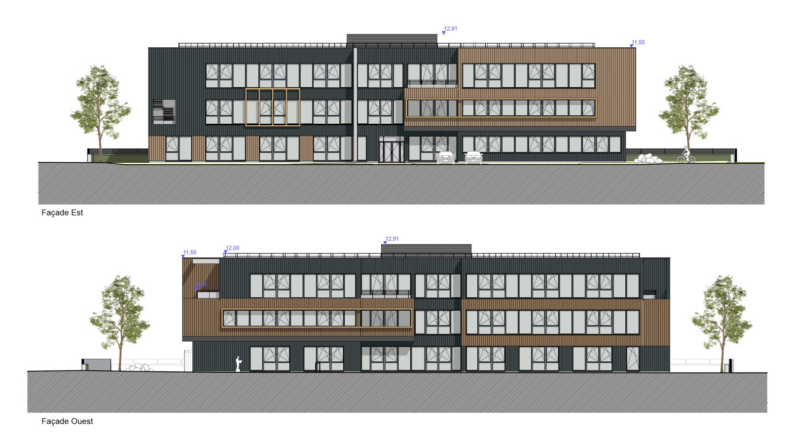 Immeuble de standing dans une zone d'activité en plein essor au Nord de Rouen, proposant des surfaces de bureaux divisibles selon les besoins Bâtiment élevé en R+2 avec une structure en bois massif, terrasse accessible à chaque étage.